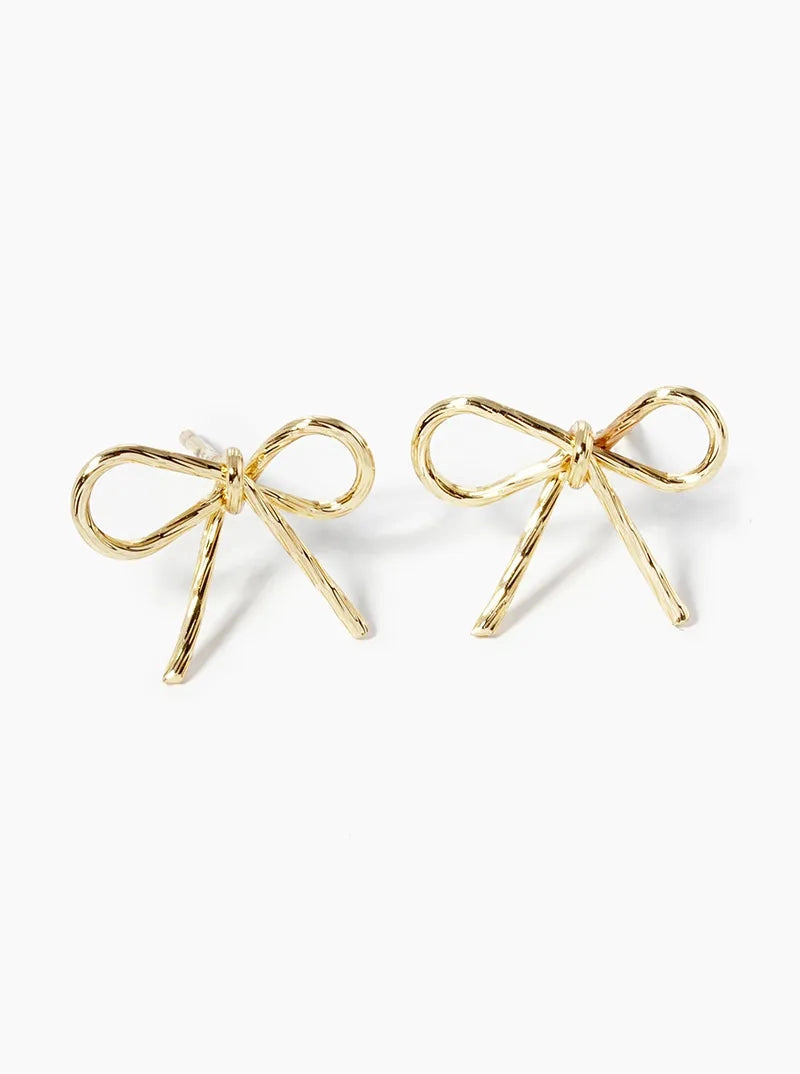 18K gold-dipped post studs featuring an elegant textured wire ribbon design shaped into a refined bow silhouette. The delicate construction combines durability with sophisticated style, making these earrings versatile enough for everyday wear or special occasions. Hypoallergenic posts ensure comfortable all-day wear. A timeless accessory that effortlessly elevates any look with understated glamour.